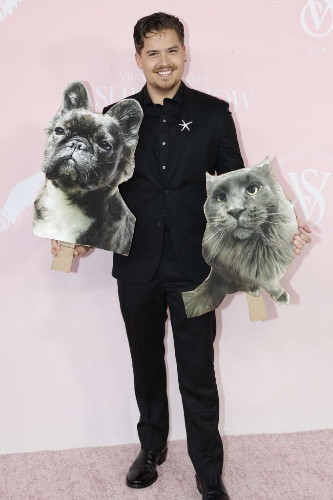 Dylan Sprouse provided the best kind of emotional support to his wife, Barbara Palvin, who was modeling in the show: animal support. He brought huge cardboard cutouts of their cat and dog. In the front row, he waved the cutouts as his wife strutted down the stage. She smiled and waved to him—or was she waving to the pets?