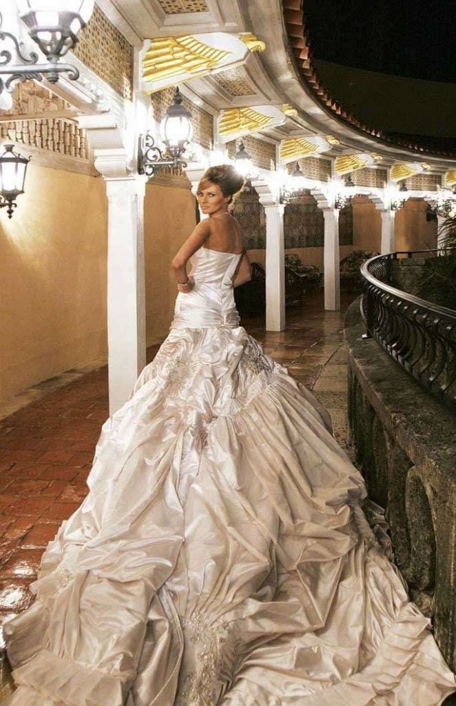 Melania wore not one but two dresses. The first was a wedding gown, which you probably can’t find in a thrift shop. The other dress, however, might just be. Unlike her usual classical styles, she wore a slinky, low-cut Vera Wang dress featuring a front slit. This look was beachy and boho-chic, and might be a hidden gem in a consignment store.