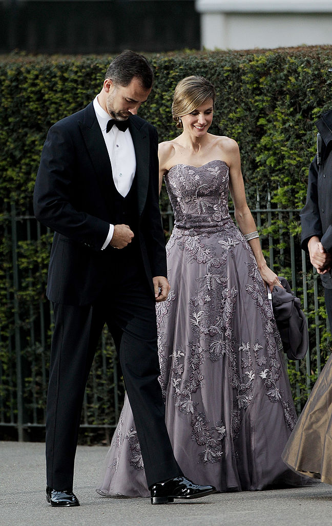 Attending Prince William and Princess Catherine’s wedding in 2011, Letizia embraced the somber London skies with a silver and grey ballgown. Designed by Felipe Varela, the dress featured floral and leaf embroidery and a dramatic tulle skirt. Her sophisticated yet stormy color palette showcased her versatility and ability to stand out in a crowd of royals.