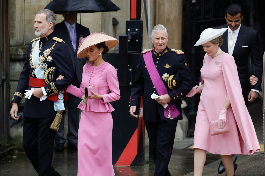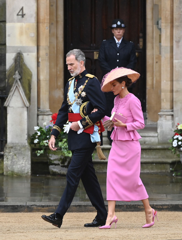 At King Charles III’s coronation in 2023, Letizia made a bold statement with a hot pink peplum jacket and matching pencil skirt. Accessorized with a pink clutch and a lace-adorned hat, she brought a burst of Spanish vibrance to the grey London backdrop. Her previous evening’s lime green gown by Victoria Beckham was equally striking, merging British design with Spanish flair.