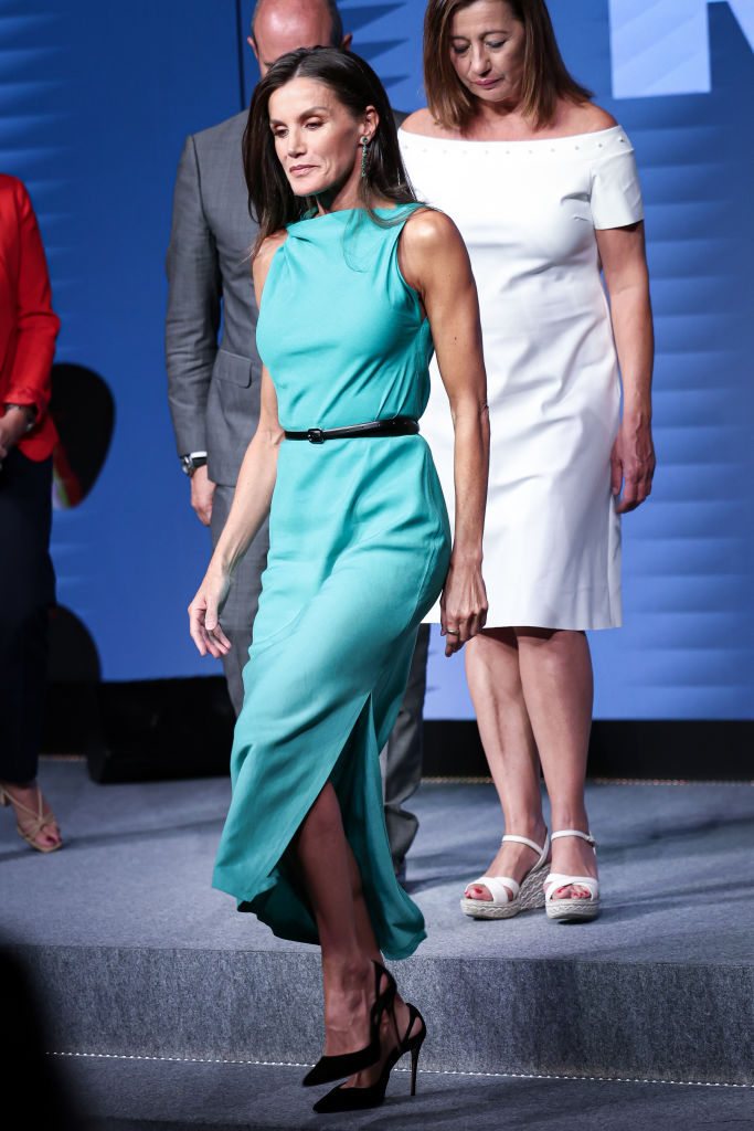 Queen Letizia has a knack for mixing high fashion with accessible pieces. At the 2023 Retina Eco Awards, she wore an ankle-length aquamarine dress from Zara, costing just €39.95. Styled with a black belt, pumps, and green earrings, she showed that elegance doesn’t have to come with a high price tag, resonating with many admirers.