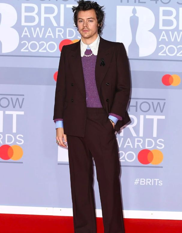1. Wearing Gucci at the Brits 2020, Styles looked as editorial chic as he’s ever been in this deep maroon look that bolds fashion and romance. Here, he wears one of the iconic peal necklaces that he’s known to rock but paired with a more masculine suit and a lighter purple sweater over a unique lace collar. This look feels futuristic, but like an homage to the past as well.