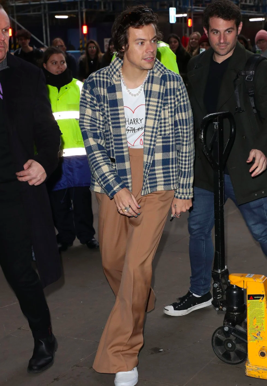 2. The pearl necklace makes an appearance here once again, this time with a grunge-meets-seventies look. A cropped plaid blazer pairs with an Alessandro Michele self-love tee and some awesome camel-toned bell-bottoms that are tailored perfectly to Harry. Only this guy could rock pants pulled up high with a tucked in tee. It wouldn’t be complete without that killer manicure, would it?