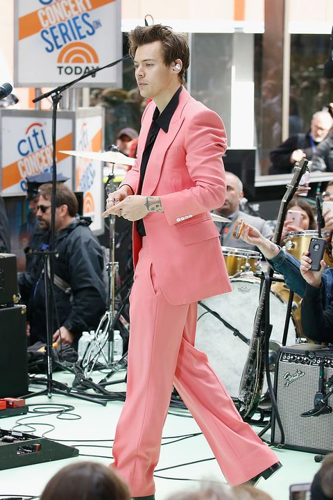 6. Every female blogger and celeb imaginable wore Millennial Pink when the shade was going through a particularly trendy period. But no one rocked it better than the gender-fluid Styles, who rocked a drapey suit with ease. Paired with silver rings and a black shirt to break it all up, Styles gave us total Mick Jagger vibes with this Edward Sexton designed lewk.