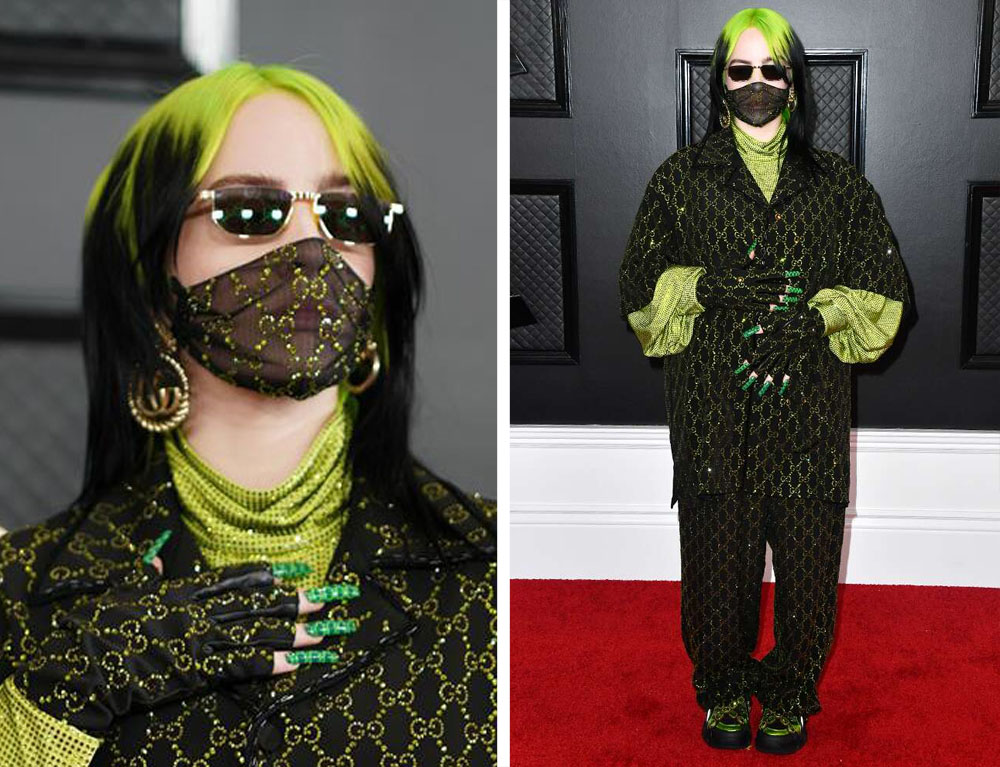 Billie Eilish rocked a custom-made Gucci look that was beyond extravagant. Tiny sunglasses, a Gucci-emblazoned face-mask, fingerless gloves, and spectacular Gucci nails with dark green design – this girl surely knows how to throw together an impressive look!