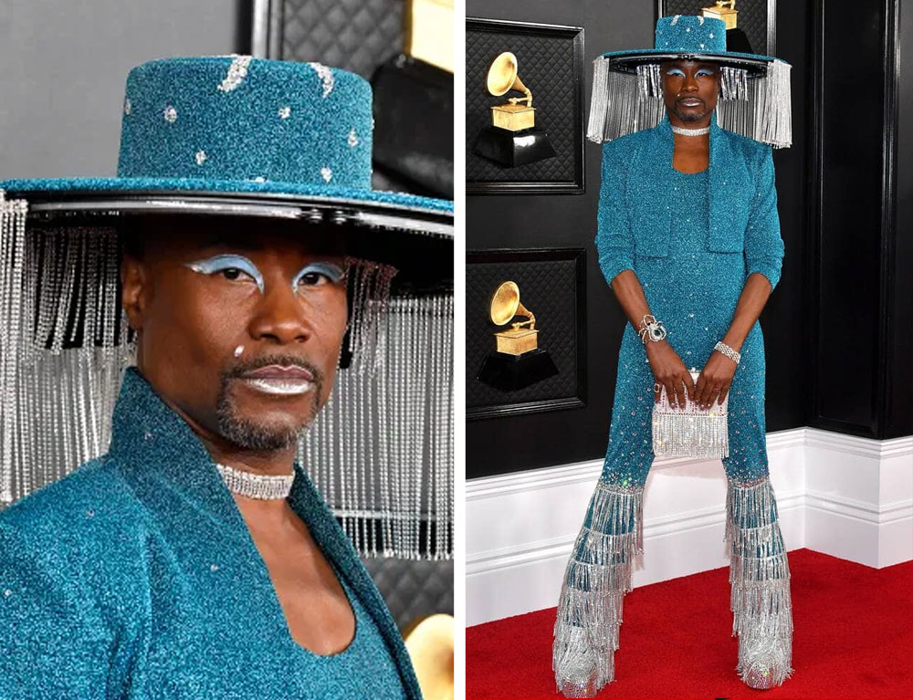 Billy Porter was the most spectacularly dressed star of the Grammys Red Carpet. He chose a glittering Baja East jumpsuit with silver fringe and a matching Sarah Sokol Millinery hat. This stunning headpiece had a remote-controlled chandelier fringe that actually moved! And once it moved, it revealed Billy Porter’s gorgeous blue makeup and sparkling jewelry.