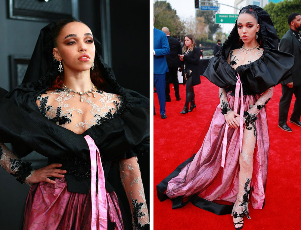 FKA twigs went for the gothic chic style and chose an Ed Marter pink gown with а ruffled neckline and a dramatic slit. Her antique jewelry matched the black and silver embroidery on the gown’s neck and sleeves.