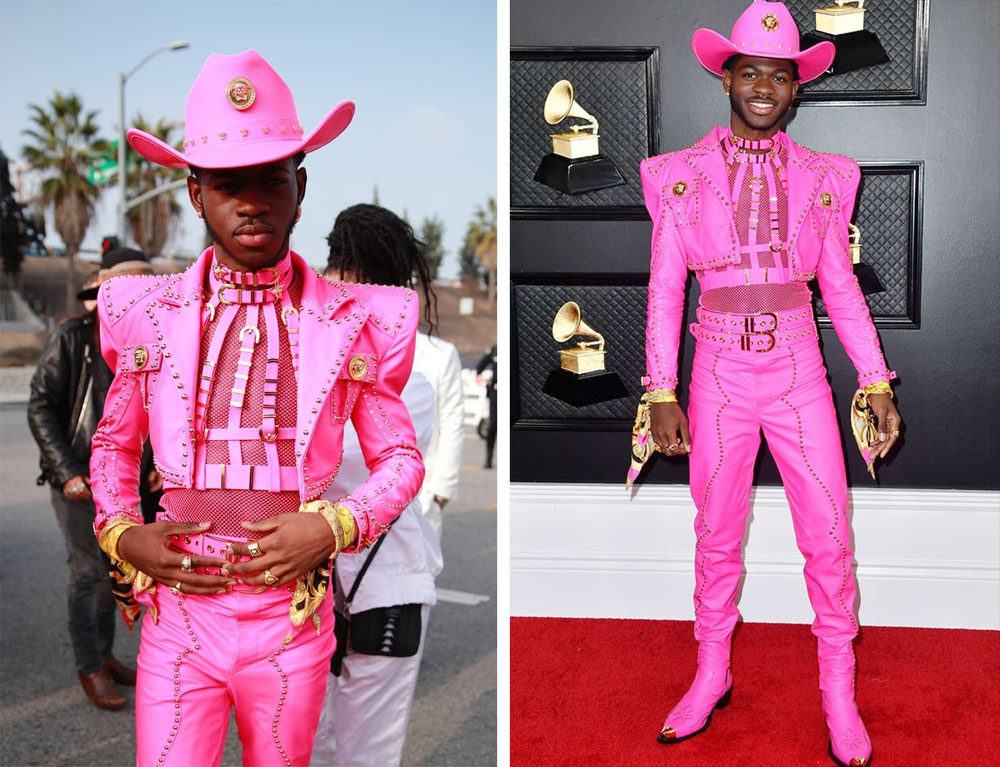 It was impossible to ignore Lil Nas X’s pink Versace ensemble. He looked eye-catching in a fuchsia leather suit donned with crystals, studs, and golden embellishments. And just look at those Medusa-clad earrings and matching buttons!