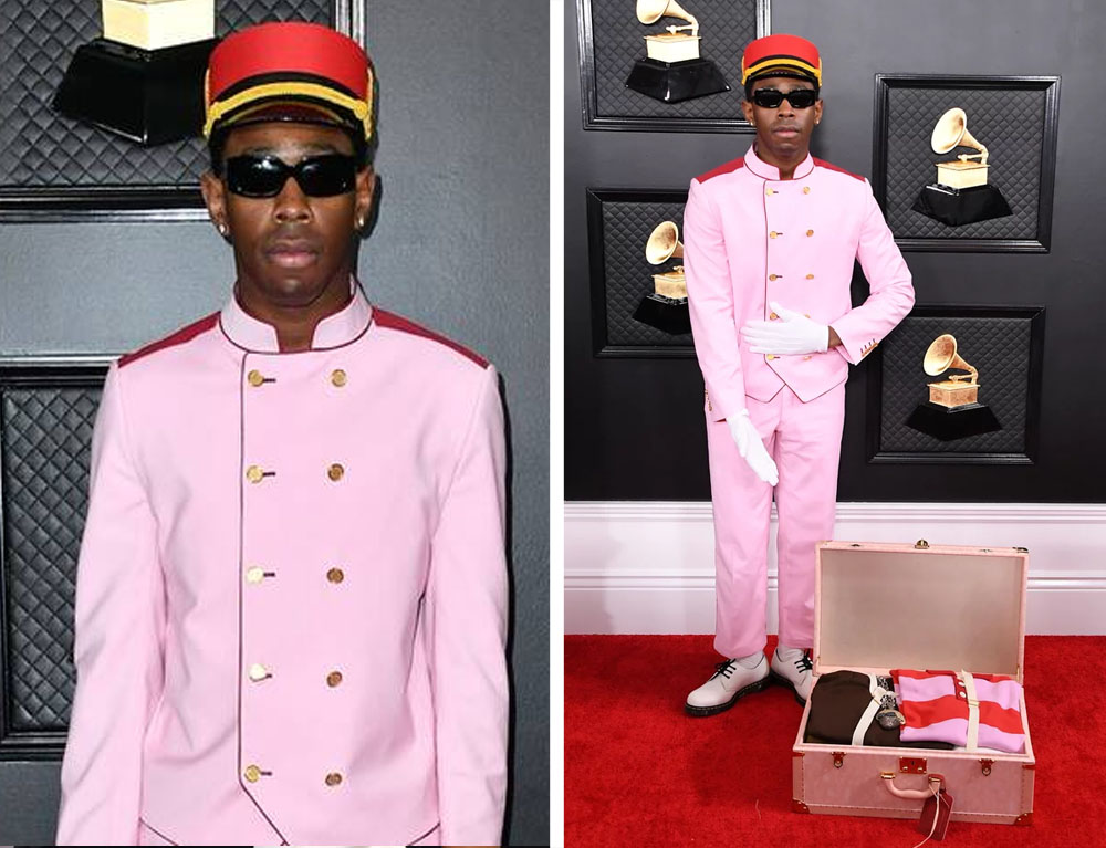 Tyler the Creator went truly over the top with his Grammys look, choosing a flamboyant bellhop chic style. He wore a pink suit by Golf le Fleur, completing the look with a red bellhop hat and a pale pink suitcase. That’s a truly unusual Red Carpet look!