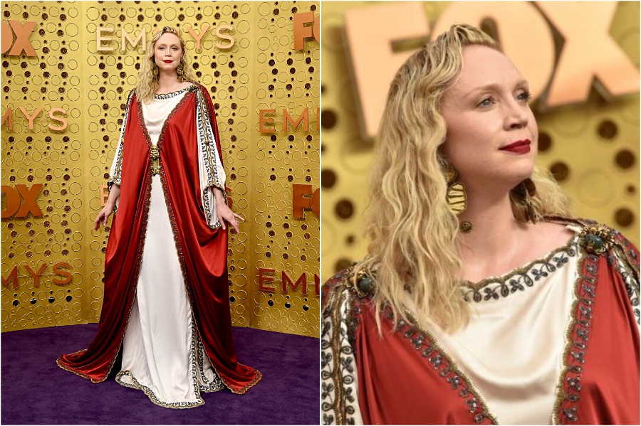 Gwendoline Christie looking both regal and goddess-like in a red-and-white in a Gucci gown at the 2019 Emmys purple carpet.