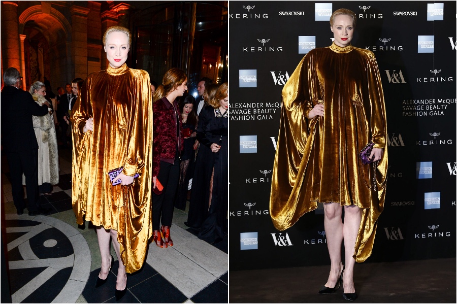 This gold satin number was the perfect choice for the event. You have to be dramatic, it’s a museum and the exhibition is all about Alexander McQueen. Drama is basically the only option at that point.