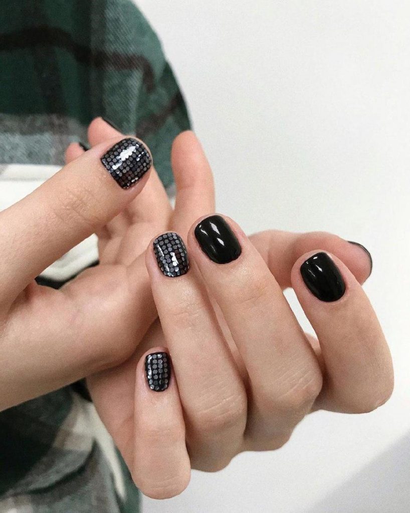 1. Black nail polish used to be associated with rock’n’roll and punk, but these days black is just a good choice to look chic with no hassle. But for an extra oomph adding some tiny sequins on a nail or two never hurt anyone.