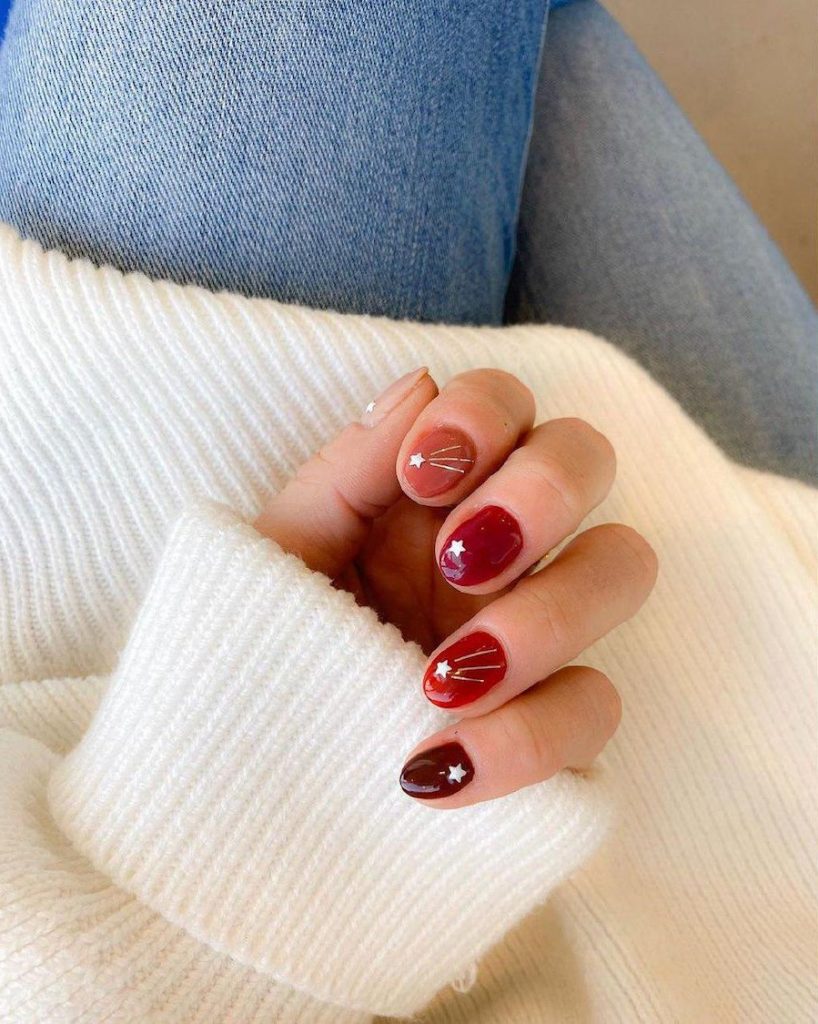2. Shades of red inevitably will make it onto your nails every winter. Somehow we just keep coming back to it as a winter color, even though it’s a year-round classic. Adding a few stars can help set you apart.