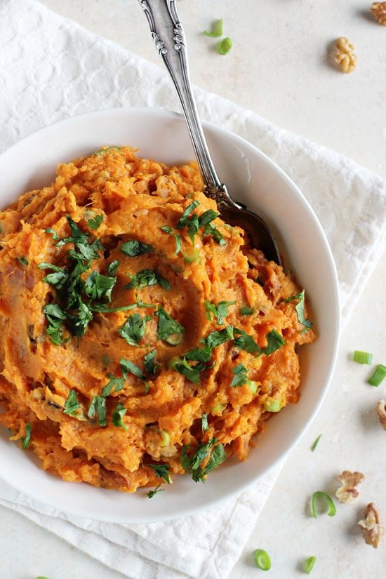 Everyone gets so hyped about mashed potatoes, but mashed sweet potatoes are just as satisfying and always hit the spot. Sweet potatoes can be sickeningly sweet when topped with maple syrup and marshmallows. But they’re already naturally sweet so we prefer our mashed sweet potatoes with some savory herbs, garlic, and spices.