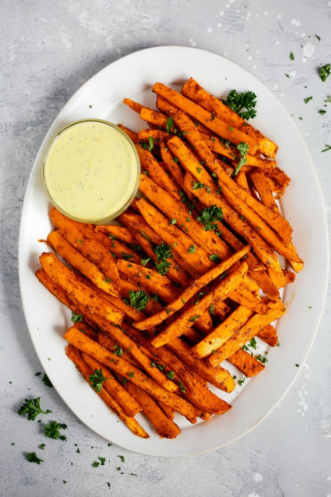 Ok, this is technically more of a side dish, but they’re so addictive, you can eat them on their own. They’re crispy, simple, deliciously seasoned, and best of all, good for you! The trick to this recipe’s success? Coating the fries in cornstarch to get that ultra- crisp exterior which is hard to get with baked fries of any sort.