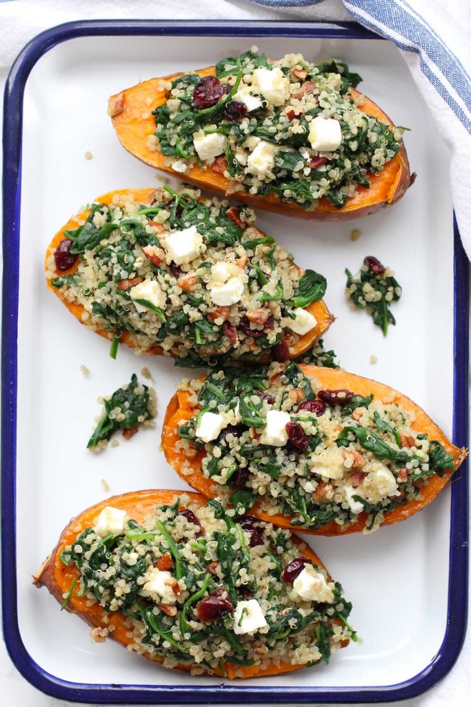 A stuffed baked potato is one of the most indulgent but calorie-filled meals out there, so why not add some more nutrition to the mix by stuffing them with veggies and quinoa. Cranberries add some sweet tartness against the fluffy grain and warm, smooth base. Combined with kale, almonds, and onions, this winter-friendly dish is surprisingly hearty.