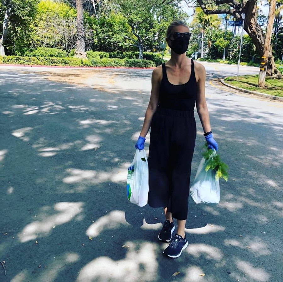 Here you can see Gwyneth wearing a mask and gloves while carrying her groceries. Wonder if Goop will come up with some face serum that protects you from the virus.