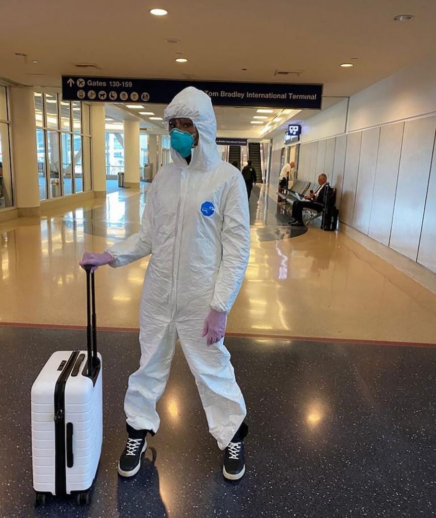 Naomi is striking poses in airports all covered up in a hazmat suit and surgical mask. Covid-19 but make it fashion.