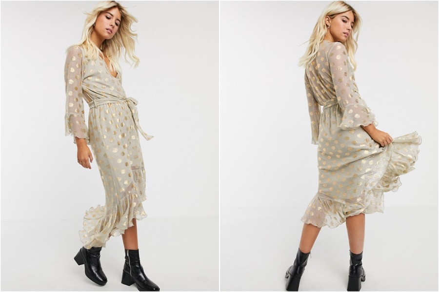 10. Gold polka dots on a nude dress are the epitome of festive but elegant. Pair it with black boots for an edgier look or a nice nude heel for a more elegant and put together one.
