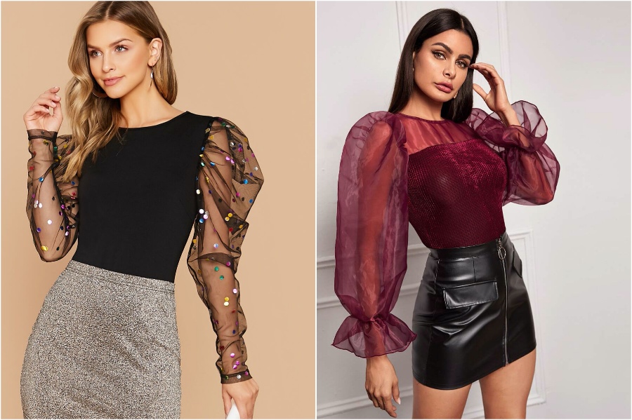 6. Puffy organza sleeves are very in this year and let’s be real, tops with sleeves like this look very festive and perfect for new years. You can go for burgundy, which is a holiday classic, or a black with confetti sequins as a party choice.