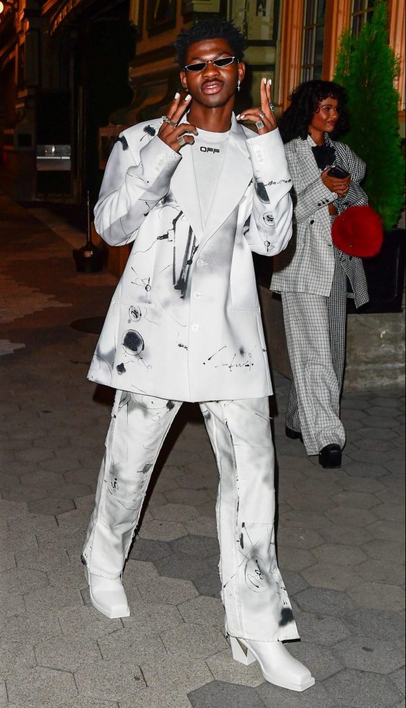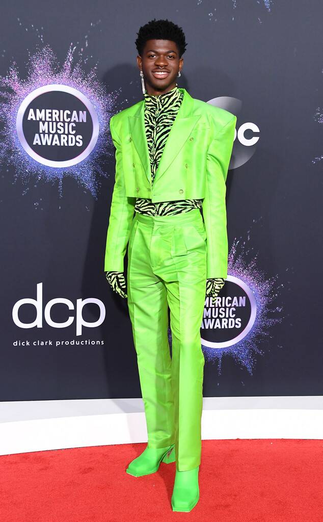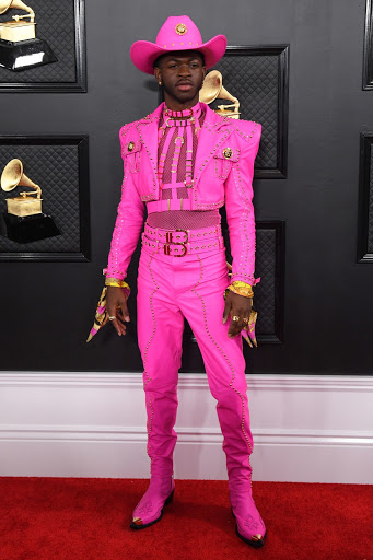 Lil Nas X took the rap scene by storm in 2019 with his crossover hit “Old Town Road,” and his fashion sense is making waves as well. For the 2020 Grammys, Lil Nas X walked the red carpet in a custom neon pink get up by Versace. His ensemble featured pink, gold-tipped cowboy boots, a pink mesh top and harness, and a pink, gold studded cowboy hat.