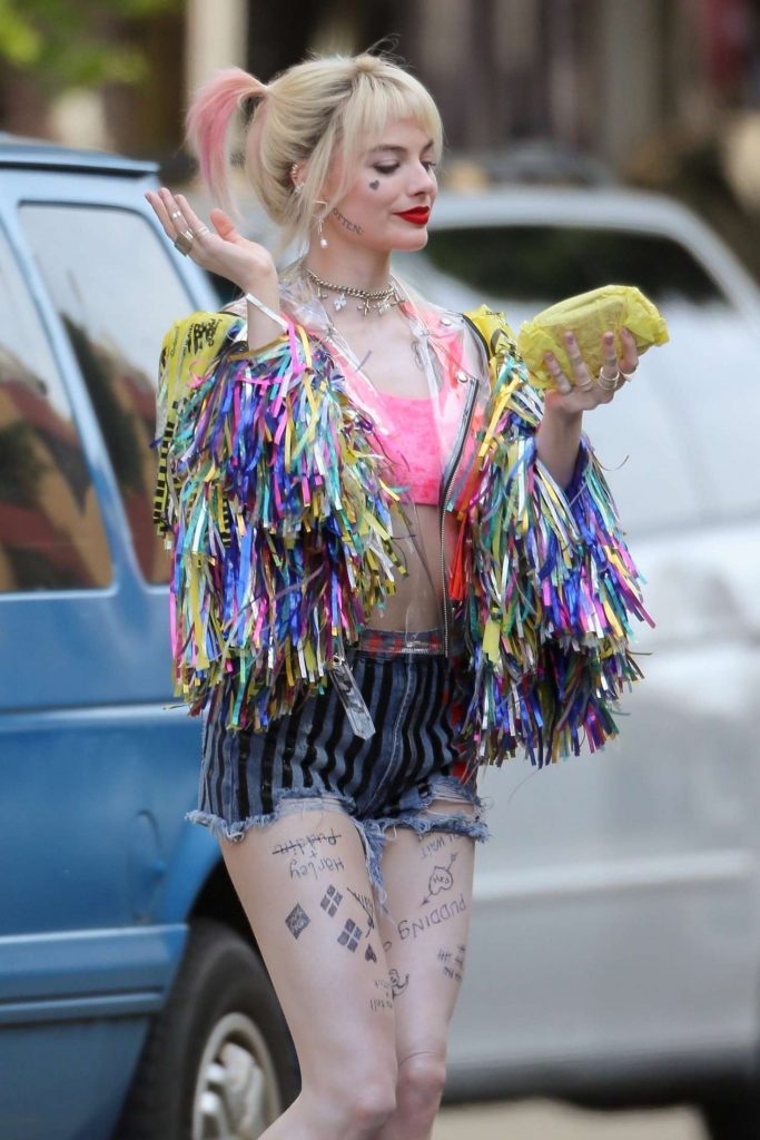Early in the film, we see Harley Quinn in the beginning of her fashion evolution. She is still rocking her iconic black and red look here, because the designer is paying homage to her “Suicide Squad” look. There are speckles of red and black in her cutoff shorts, and the addition of flames up the side panel made the look a lot more fiery.  It was a nod to her origin with the promise of a new beginning.