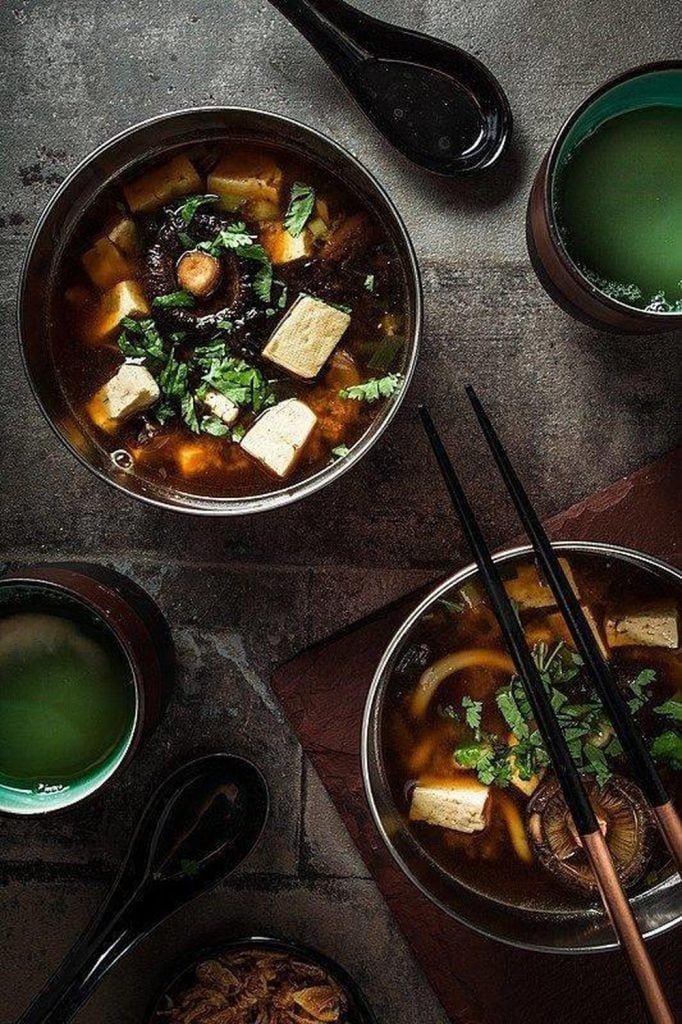 Japanese cuisine is light, savoury, and uses lots of sea products. You might not be ready to make sushi yet, but there are meals you can prepare in a matter of minutes! The main ingredient for miso soup is special miso paste made from fermented soy beans. Basically you just have to mix it into hot water, then add more hot water, and boil till ready (which usually takes around 5 minutes). You can add greens, tofu, and nori weeds to make your soup more flavourful.