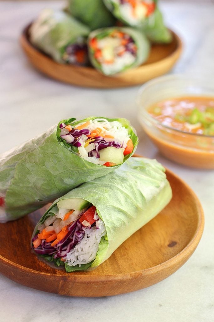 They are called spring rolls, but you can actually make them all year round. Spring rolls are very light as they are prepared with rice wrapping paper, rice noodles, and fresh veggies. Inside you can have different fillings, but the general idea is to keep spring rolls light, using leafy greens, rice noodles, and vegetables like carrots and cucumbers. It’s best to serve spring rolls with a flavourful sauce.