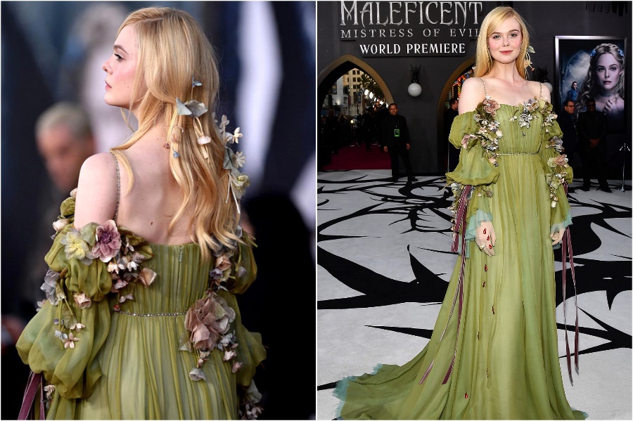 We love this loo Elle Fanning wore to the Maleficent premiere. It’s not a flower crown, it doesn’t even look like some flowers she just tucked in her hair. It looks like a natural continuation of her dress that just extends onto her hair. How freaking cool is that?