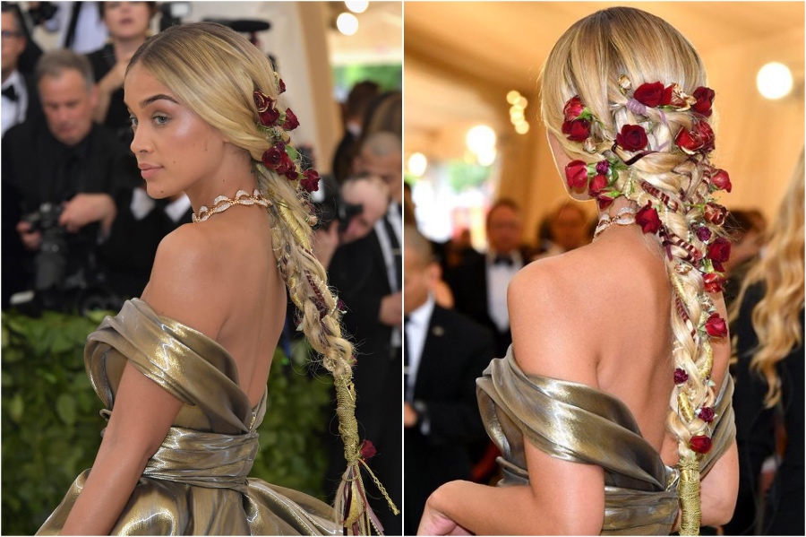You’d think putting a flower crown on top of a pink bob haircut would just look basic and very “summer music festival” like. But by choosing beautiful flowers and pairing it with beautiful earrings and a very light flowy, almost fairy-tale like dress Hailey Bieber looked very chic at the Met Gala 2018.