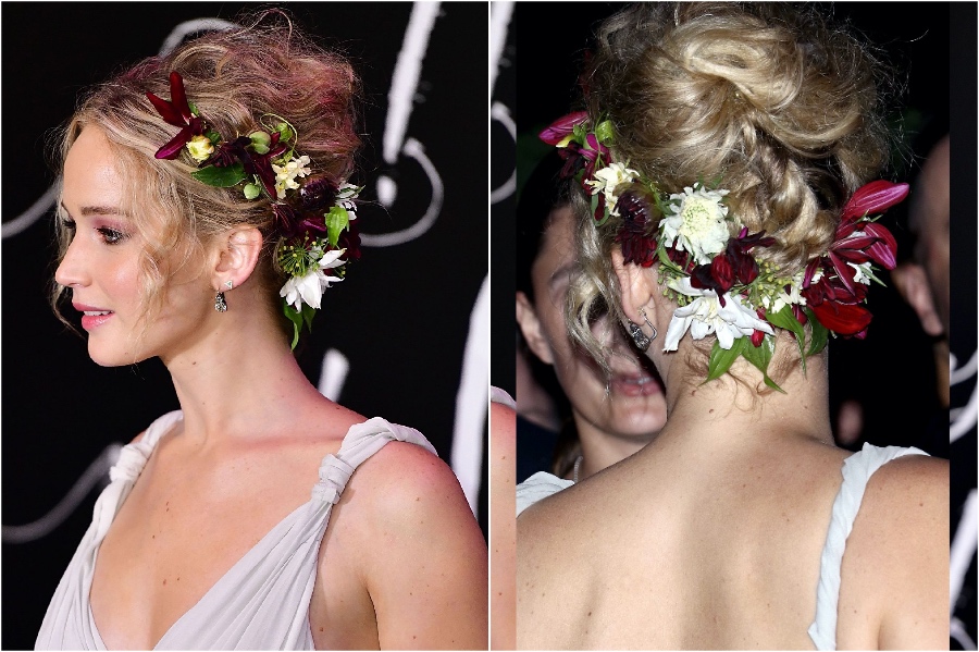 Jennifer wore a flower crown to the Mother! Premiere, but instead of it going on top of her hairstyle, this one wrapped under her messy updo. We also noticed that some of the flowers matched her eye makeup – what a nice touch.