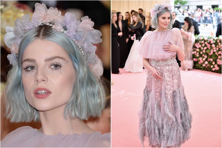 Here’s Lucy Boynton at the Met Gala rocking a flower crown and looking spectacular. Obviously, those aren’t real flowers, they’re made of fabric, possibly the same fabric her dress is made of. But you’ve got to admit that matching them to the dress and adding those crystals to the band and painting on those lashes with sparkly eyeliner pulled together a very ethereal and mesmerizing look.