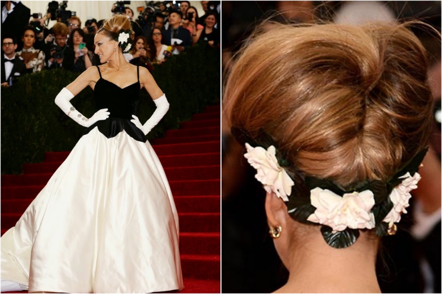 Sarah Jessica Parker is not a stranger to strange hats and hair accessories, we’re kind of used to seeing her do something very loud and out there with hair accessories. But for the Met Gala 2014, she chose a classy and quite minimalist (for her) approach of just three white flowers wrapped under her big and voluminous updo.