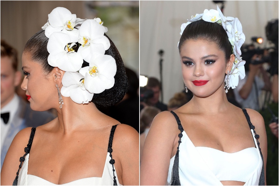 At the 2015 Met Gala Selena Gomez went for a very girly yet classy hairstyle. A slicked back updo with stunning white orchids framing her head. It’s incredibly feminine and worked very well with that gorgeous white dress she was wearing.