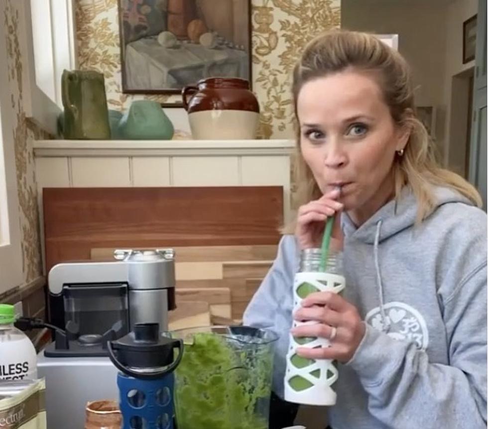 Ok, this isn’t the most revolutionary breakfast meal, but a lot of people don’t meet their daily quota for greens, because you need to eat a heaping pile of it and that’s not exactly appealing. Instead, Reese gets her daily fill with this tasty and healthy recipe, which consists of two whole heads of lettuce, a quarter cup of spinach, pear, apple, celery, banana, and an entire lemon — including the seeds! She also adds coconut water and almond butter.