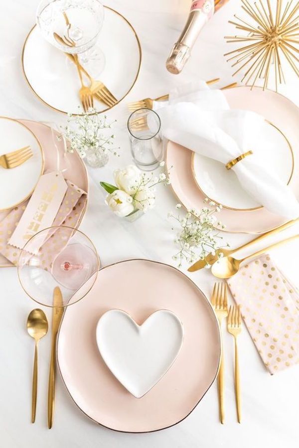 6. We loved this table setting because there’s no actual mention of Valentine’s Day but you can still sense a theme thanks to pink dishes and heart-shaped plates. The gold cutlery in a nice touch too. What a pretty color scheme this is, and perfect for celebrating a day of love.