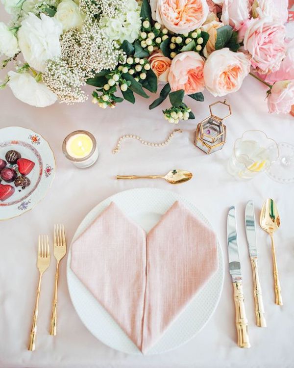 7. Another creative solution where you just work with the pink color theme but don’t buy anything special. Flowers always dress up a dinner table, a few heart-shaped chocolates, and creatively folded napkins and you’re done.