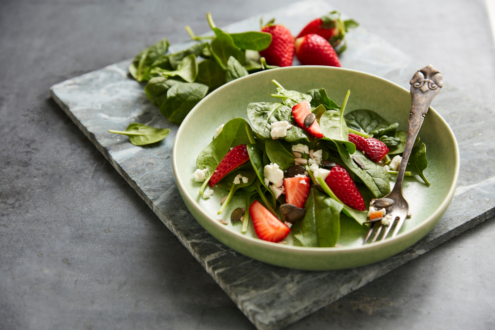 Fruit in a salad? This might some blasphemous for some, but fruit is the best way to brighten up a salad and make eating your vegetable significantly easier. Strawberries is one of our favorites, especially with spinach and kale. This recipe adds in quinoa, and we suggest taking liberties with goat cheese, since it adds some tangy creaminess into the mix.