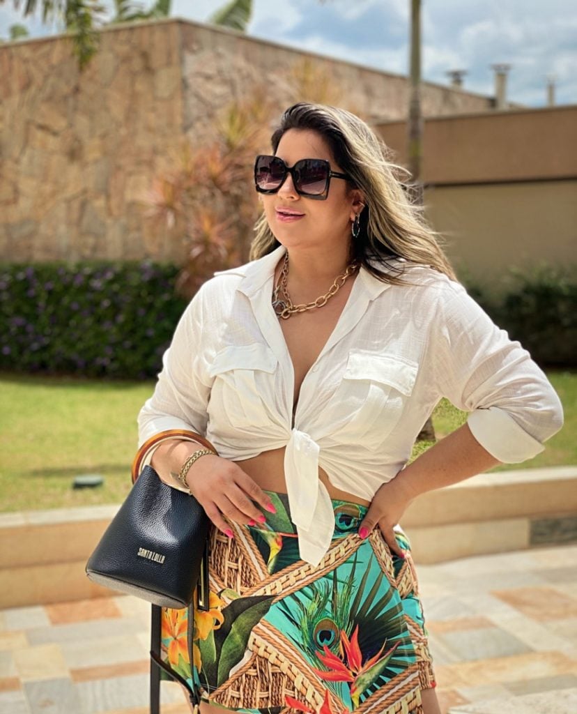This look is expensive and screams “I’m on vacation!” A tropical skirt paired with a gold chain necklace and a white button-down that’s not buttoned but tied and styled like a crop top.