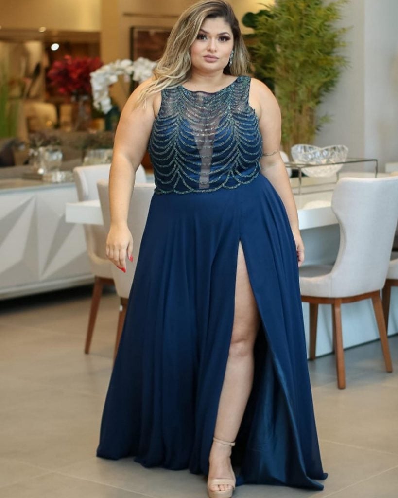 Now, this is how you do plus-size formalwear. Paula Martins is slaying in this long blue gown with sheer paneling and a stunning thigh-high slit. It’s hugging her in all the right places and her confidence seriously completes the look.