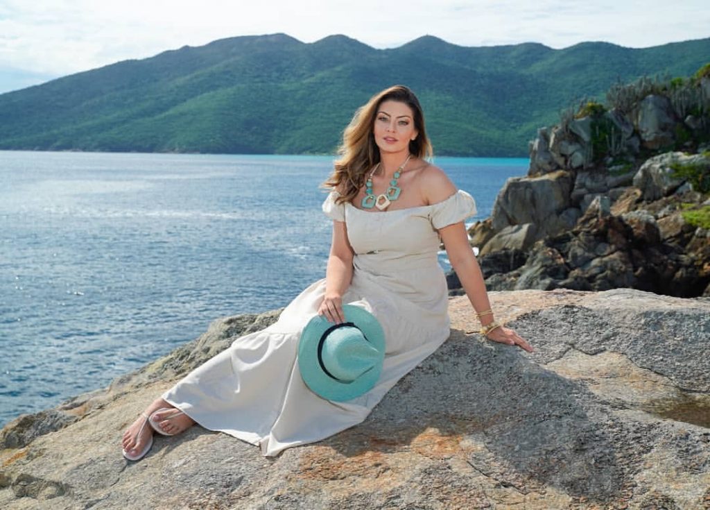 Curvy Brazilian model shows how to do beach coverups right. The chunky necklace and hat perfectly match, while her off-the-shoulder, flowing maxi dress looks like a comfortable and lightweight option to wear by the water.
