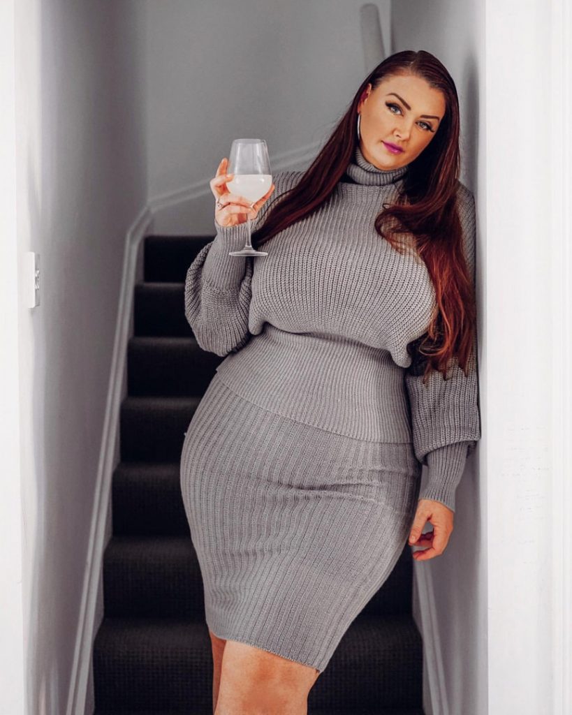Sometimes, going gray can be blah and can hide your curves rather than showing them off in the right way. Instead, spice it up with some texture like this ribbed turtle neck dress look with more narrow piping on the top.