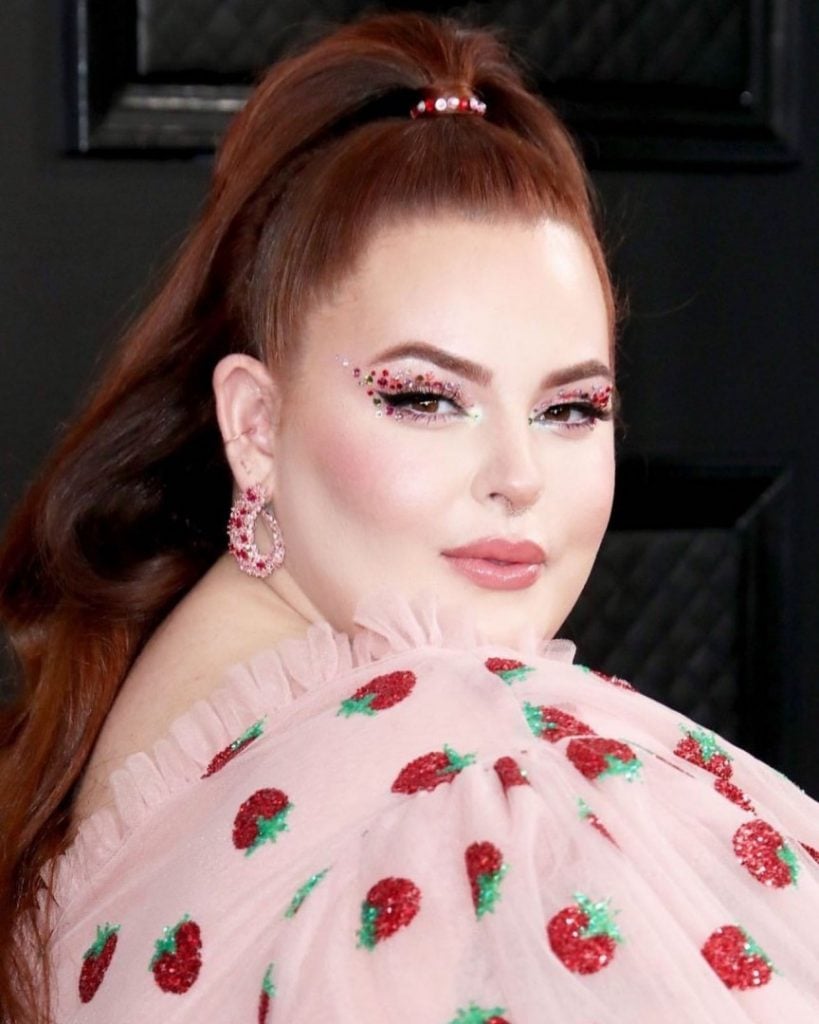 We love how Tess Holiday has no fear about trying bold looks in her makeup, accessories, and outfit. She’s a role model that reminds us all to embrace and express our true selves. Here, she’s serving up strawberry shortcake vibes with bedazzled eye accessories and a strawberry print dress.