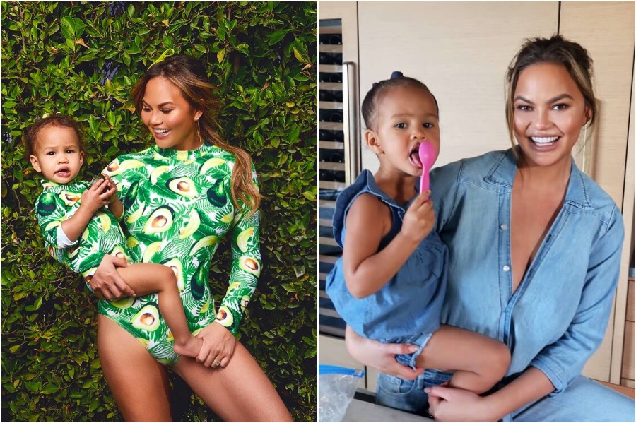Chrissy Teigen and her daughter Luna dressed in identical swimsuits is summer vacation goals, but while we can’t go on vacation let’s match their chilling at home all denim vibes?