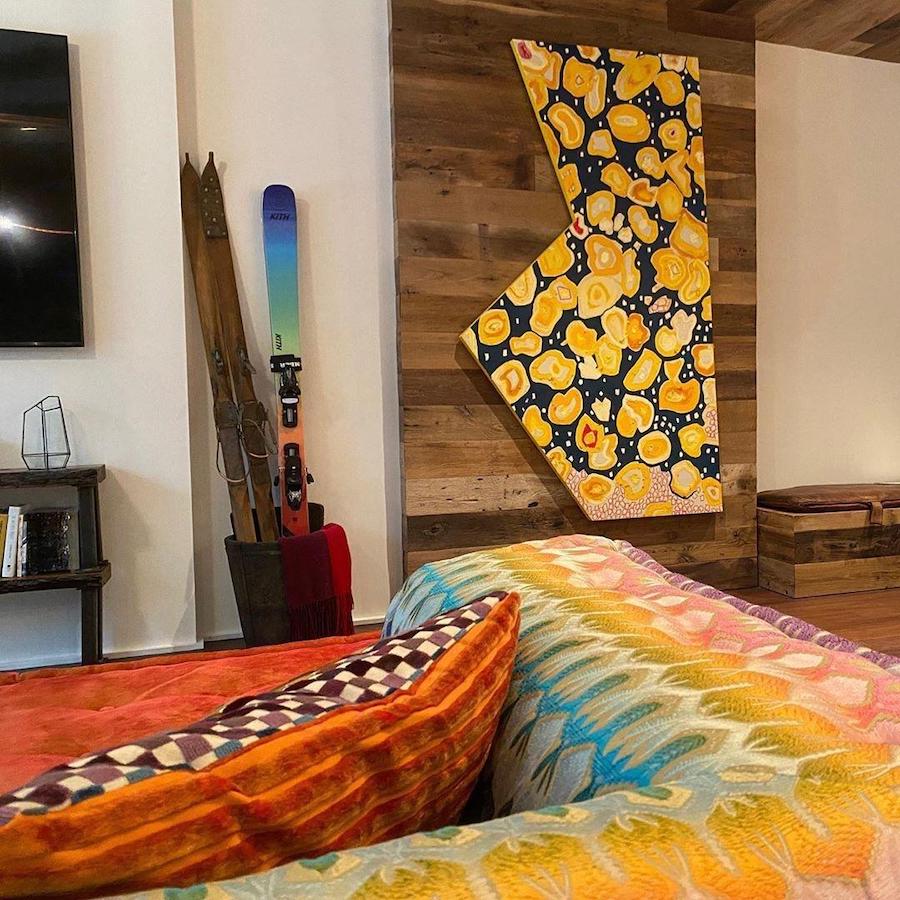 We also noticed the irregular shaped art piece painting in the living room that was done by Austyn, definitely a big feature in the living room area. In fact, there are quite a few artsy things around the apartment and on the walls if you pay attention. We love the sign next to the bathroom that says that all types of people are welcome and safe in this place. It’s definitely something that shows Gigi’s views. We also noticed that the rug on the stairs is incredibly colorful and bright and it almost looks like each step is different. Same goes for Gigi’s kitchen cabinets that feature macaroni art (not edible) of a different color on each cabinet.