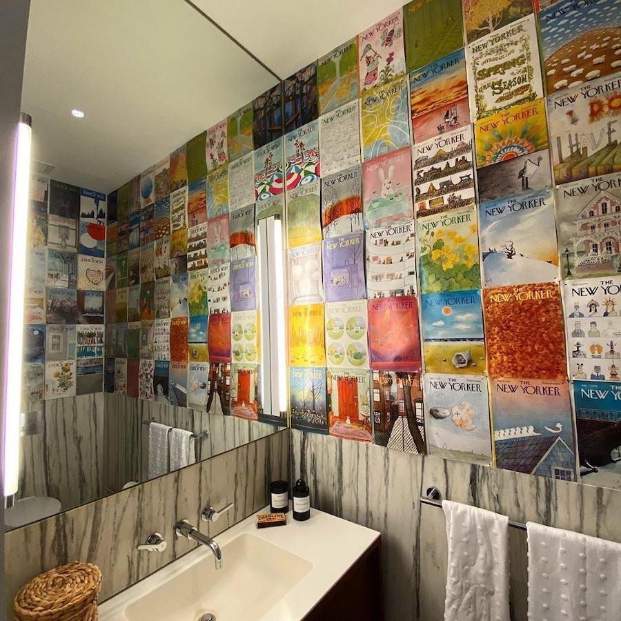 As you can see the apartment features a lot of yellow and orange decorations, from couch pillows to paintings to a massive yellow pen next to the bathroom. Speaking of the bathroom, the walls in there are decorated with New Yorker magazine pages, which definitely brings the idea of reading in the bathroom to a whole new level. We also love the little Jean-Paul Gaultier throw pillow on the couch, such a small detail but such a fancy accent that speaks of Gigi’s taste in fashion.