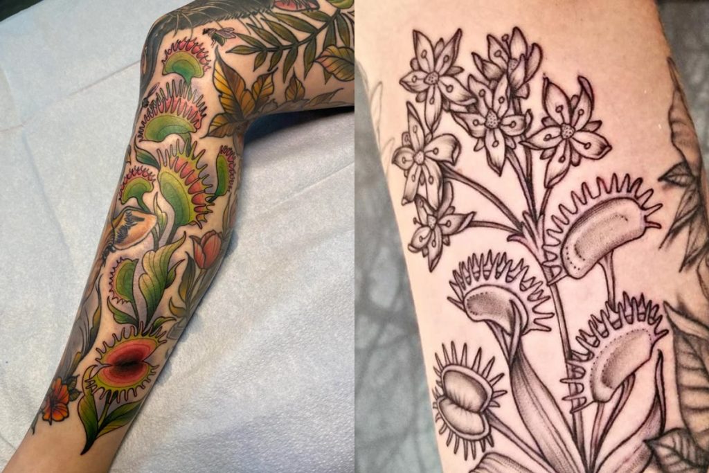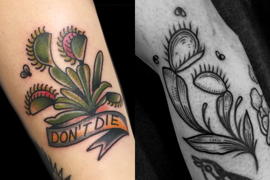9. Venus Flytrap is certainly an original tattoo idea. We all know it’s a carnivorous plant, but few people know that it symbolizes persistence and that it actually blooms. The flytraps are red and green, but the flowers are white and grow tall above the flytraps on long stems.