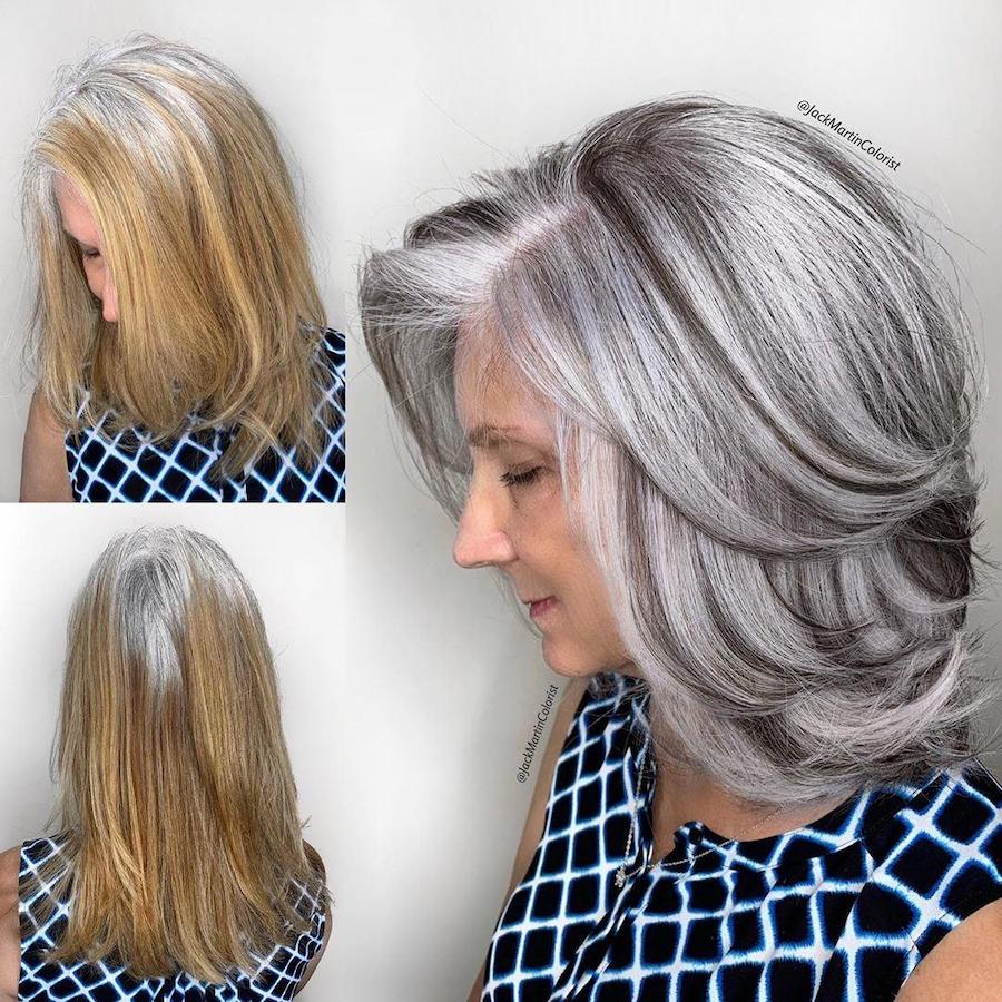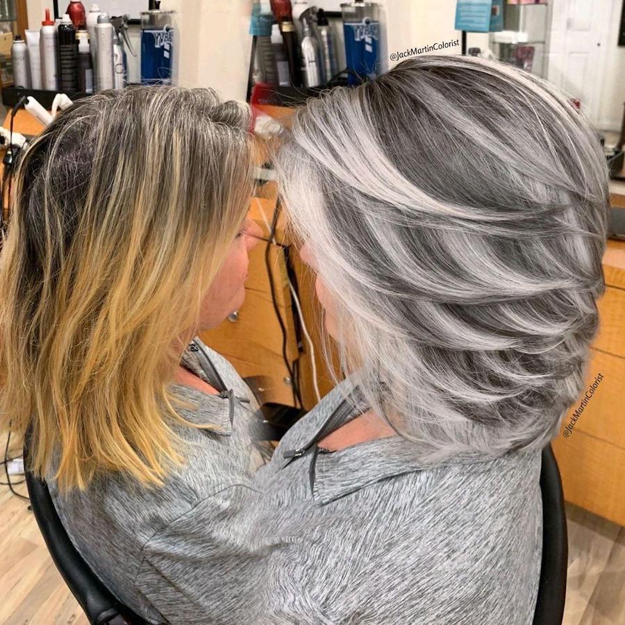 What’s your opinion of gray hairs? Do you have any? And if you do, are you bothered by them? A lot of women, in general, have 3 approaches to this “problem”. If there are only a few gray hairs lots of women will just pluck them or change their parting to hide them and let them be, and if there’s a lot of them – most will dye their hair every three weeks to hide them. But why are we so against gray hair? Why do we choose to hide it and spend so much money to make it look like we don’t have it? Are we really that insecure about gray hair or is this all part of the beauty industry pressure that creates a problem and then profits off of our insecurities? Jack Martin, a hairdresser based in California, came face to face with this problem and found a brilliant solution. When a lady with gray roots came into his salon and said she’s tired of dying her hair every 3 weeks and wants a more manageable option he offered to color her hair gray and embrace the change. The result is absolutely stunning and once he posted it online Jack has been getting more clients asking for the same solution. But what’s unique is that Jack doesn’t just give everyone the same silver hairdo. He makes sure to match every client with the right kind of gray to match their roots.