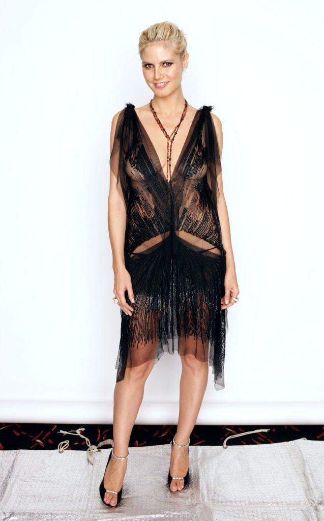 Back in 2004 (only months after giving birth to her daughter Leni) Heidi stepped out at the World Music Awards in a black dress that looked like it wouldn’t be out of place in a 1920s jazz club, yet had a modern edge to it. With no bra in sight and slashes of beads barely skimming over the essentials, the dress was the kind of ensemble that makes stylists nervous and photographers ecstatic. The semi-sheer skirt left little to the imagination—but Klum wore it like it was no big deal. And to her, it probably wasn’t.
