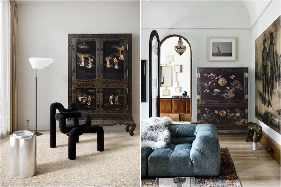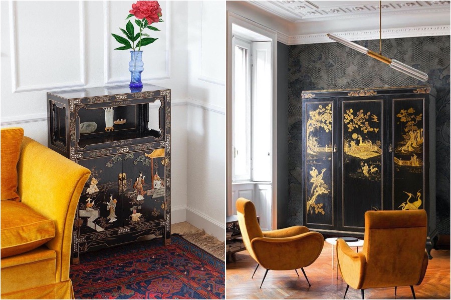 If you want to really make a statement, get a lacquered Chinese style cabinet. You can use it to store anything you want, but it’ll definitely give your room a whole new look. It’s just one piece of furniture but if you get a really cool vintage one – you really don’t need more than one.